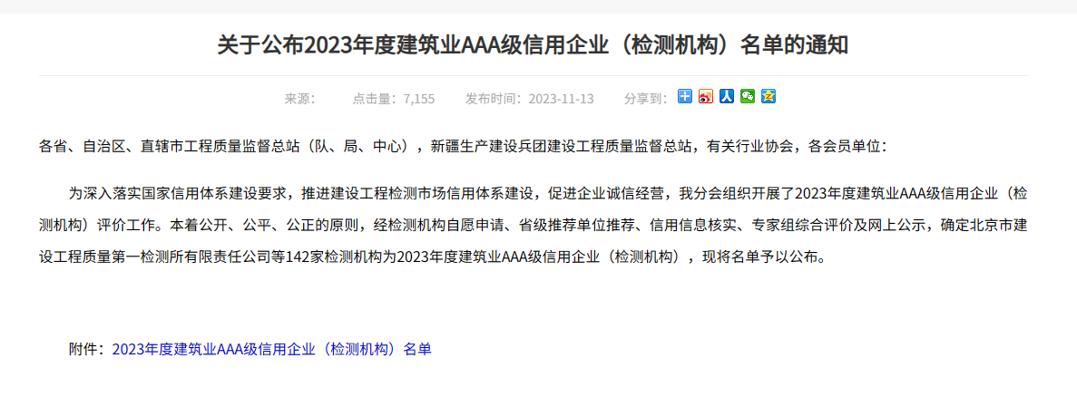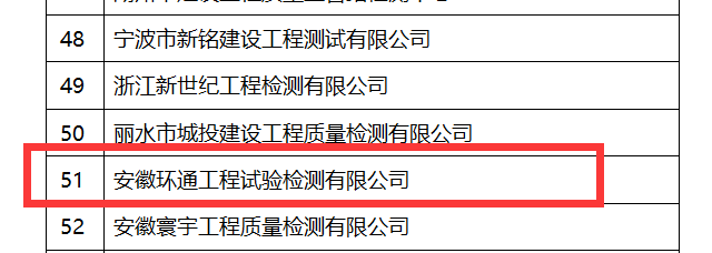 近日,中國建筑業協會公布了2023年度建筑業AAA級信用企業(檢測機構)名單,安徽環通工程試驗檢測有限公司榜上有名。