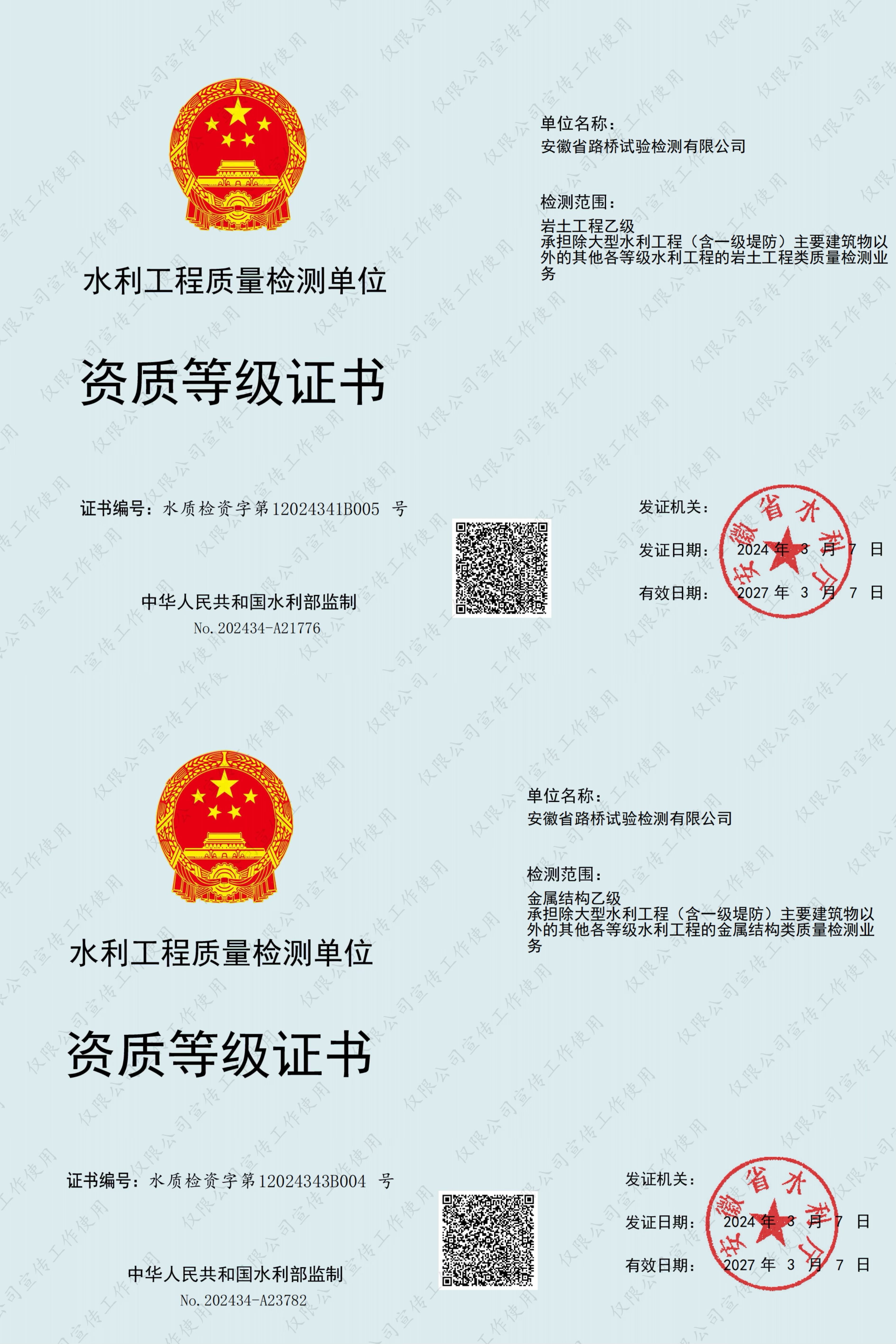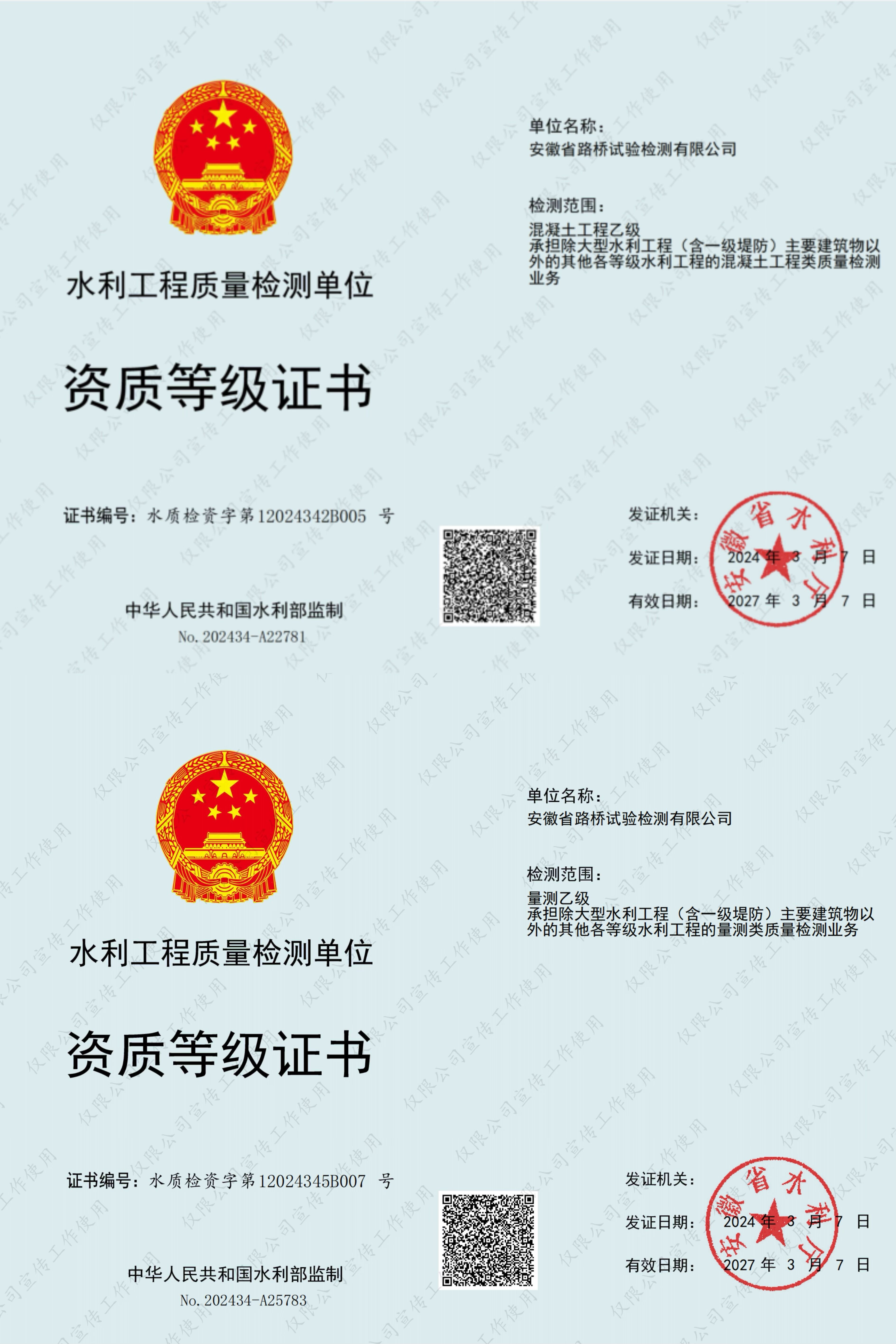 此次水利工程質量檢測四項乙級資質延續不僅是對路橋檢測公司水利業態過去工作的認可,更是對未來發展的信心和支持。作為水利工程質量檢測領域的重要參與者,路橋檢測公司認真踐行“五化五做”發展理念,不斷拓寬資質平臺,增強檢測專業化水平,為安徽省的水利工程建設提供了可靠的技術支持和服務保障。