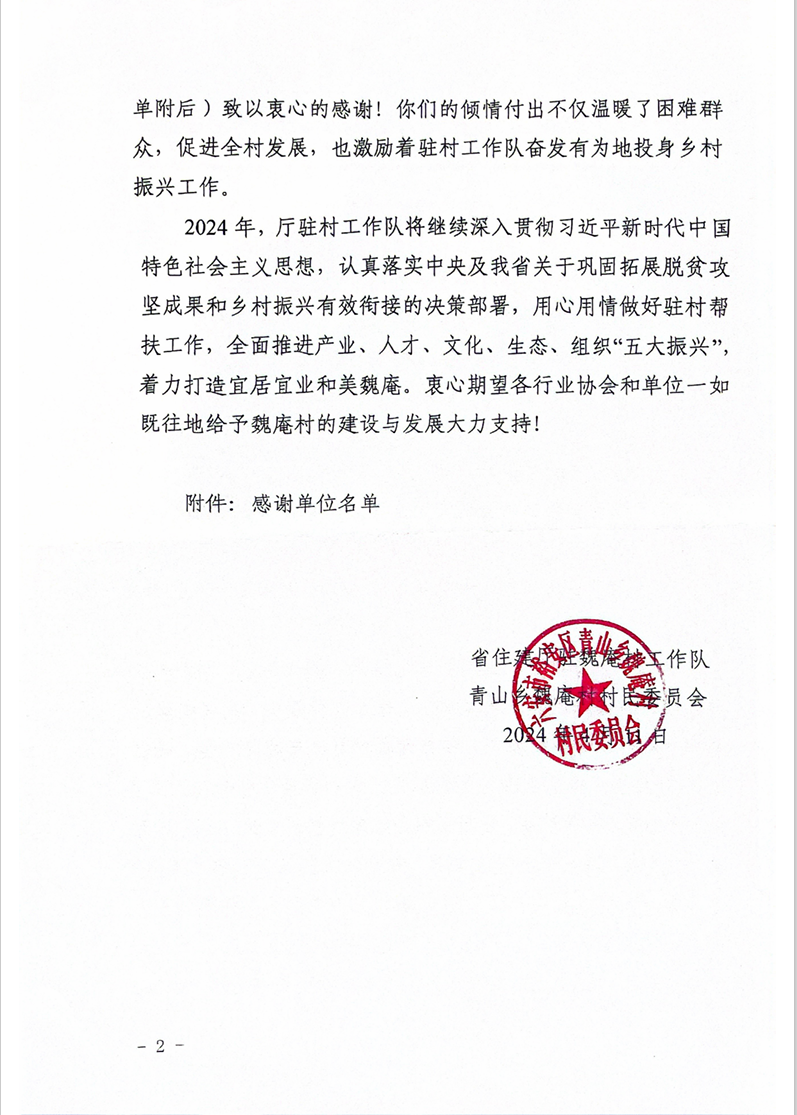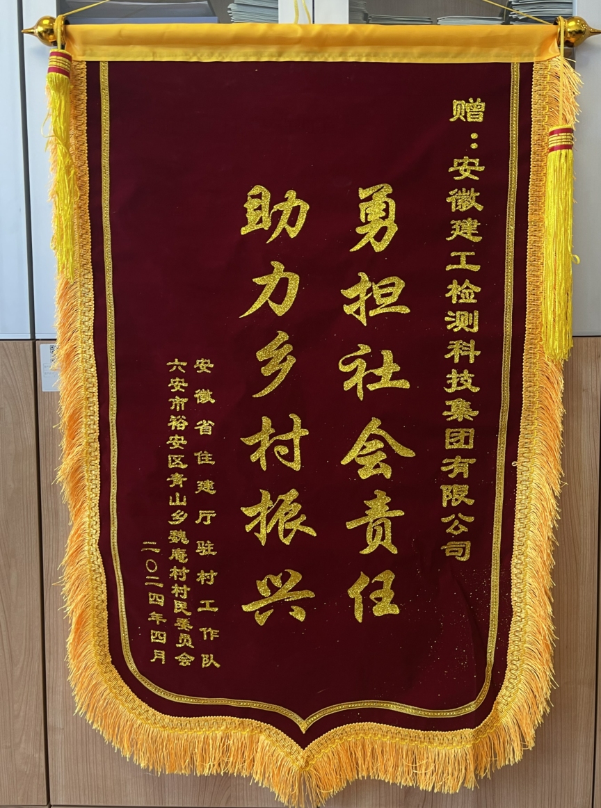 近日,建工檢測收到了省住建廳駐魏庵村工作隊、青山鄉魏庵村村民委員會聯合發出的感謝信和錦旗,信中對建工檢測在助力脫貧攻堅、推進鄉村建設等方面的傾情幫扶,給予了充分的肯定和衷心的感謝。