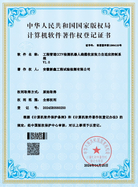 近日,安徽新鑫工程試驗檢測有限公司成功獲得5項軟件著作權:工程管道CCTV檢測機器人線纜收放張力自適應控制系統、道路連接結構部件穩固性檢測系統、鋼筋混凝土結構保護層厚度檢測與安全評估系統、工程檢測吊錘穩定性校準檢測系統、混凝土摻合料抗剪切力安全檢測與管理系統。