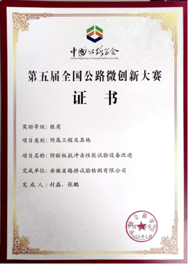 近日,中國公路學會發布了《關于公布第五屆全國公路微創新大賽評選結果的通知》,安徽省路橋試驗檢測有限公司創新成果《防眩板抗沖擊性能試驗設備改進》獲得“附屬工程及其他組”銀獎。同時也是我省交通行業唯一獲得此類獎項的單位。
