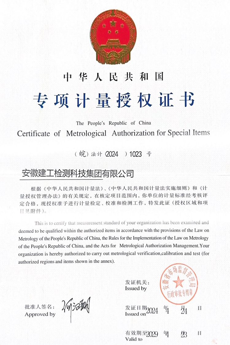 近日,建工檢測收到來自安徽省市場監督管理局印發的專項計量授權證書,標志著本次回彈儀檢定、校準“專項計量授權”復審工作在經過前期準備、現場評審、完善整改、審批發證等數個階段后,圓滿收官!