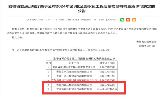 10月14日,安徽省交通運輸廳發(fā)布公告,安徽新鑫工程試驗檢測有限公司正式獲批公路工程乙級和水運工程材料丙級兩項等級資質(zhì)。