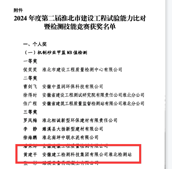 喜報(bào)!淮北檢測站榮獲2024年第二屆淮北市建設(shè)工程試驗(yàn)?zāi)芰Ρ葘︳邫z測技能競賽個(gè)人三等獎(jiǎng)