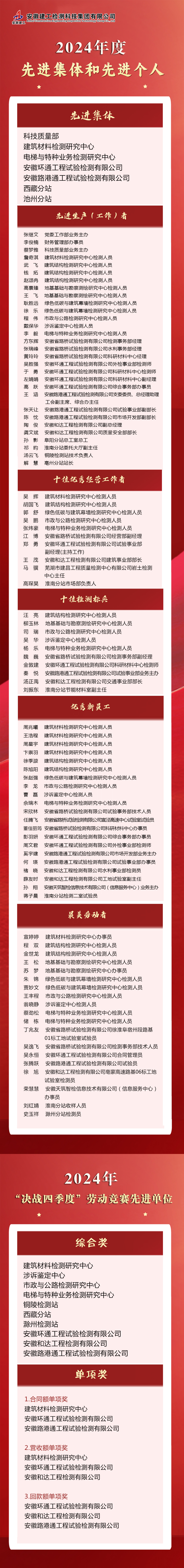 2月26日至28日,安徽建工檢測科技集團有限公司一屆三次職代會暨2025年工作會議在合肥召開,會議期間,對2024年度先進集體和個人、“決戰四季度”勞動競賽優勝單位進行了表彰,公司領導班子成員出席會議并為受表彰單位、個人頒獎。會議號召,全體員工積極踐行“誠信共贏、卓越創新、忠誠擔當、敬業清正”集團核心價值觀,振奮精神,開拓進取,奮力譜寫建工檢測改革發展新篇章,為推動建工集團轉型發展、高質量發展、大發展貢獻更大力量。