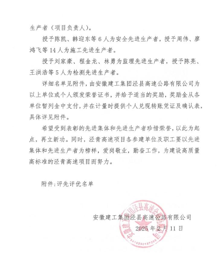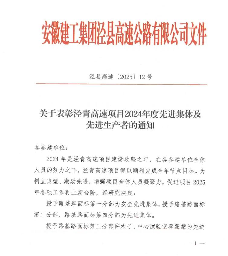 近日,從安徽建工集團涇縣高速公路有限公司傳來喜訊,路橋檢測宣城至東至高速公路涇縣至青陽界段中心試驗室蔣蒙蒙等4位同志分別榮獲2024年度先進生產者(項目負責人)、先進生產者(檢測)人員稱號。