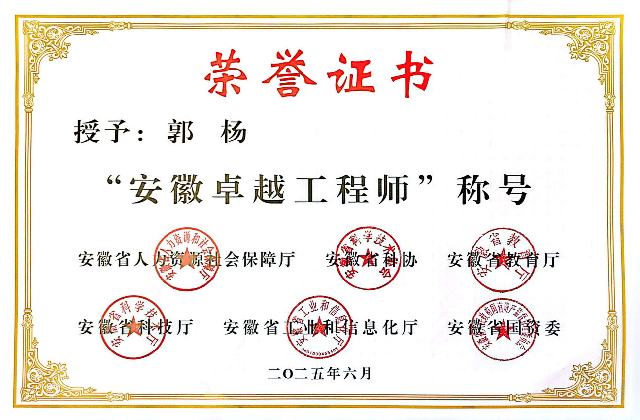 近日,從安徽省住房和城鄉建設廳傳來喜訊,公司黨委委員、副總經理、工會主席郭楊憑借在工程領域的突出貢獻,榮獲首屆“安徽工程師獎”,被授予“安徽卓越工程師”稱號。此次評選由省人力資源社會保障廳、省科協、省教育廳、省科技廳、省工業和信息化廳、省國資委等六部門聯合開展,旨在表彰在重大工程建設、關鍵技術攻關等工作中成果顯著的工程師。