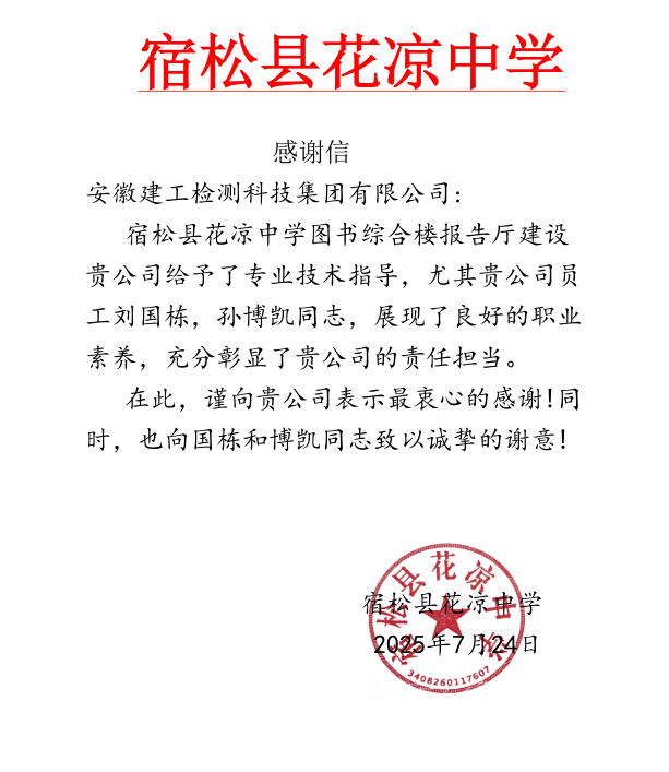 近日,宿松縣花涼中學向建工檢測發來感謝信,對公司特檢中心在宿松縣花涼中學圖書綜合樓報告廳建設過程中給予的專業技術指導表示感謝,并對公司的責任擔當和員工的職業素養給予充分肯定。
