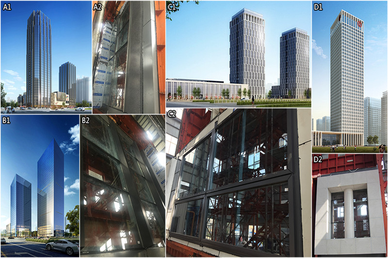 圖 3 幕墻檢測:(A) 濱湖寶文國際廣場;(B) 華地金融中心;(C) 國際智能語音產(chǎn)業(yè)園;(D) 中國銀行