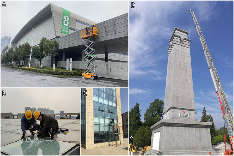圖 4 幕墻安全鑒定:(A) 濱湖會(huì)展中心;(B) 馬鞍山匯通采光頂;(C) 滁州晶田;(D) 金寨革命烈士紀(jì)念碑修繕工程