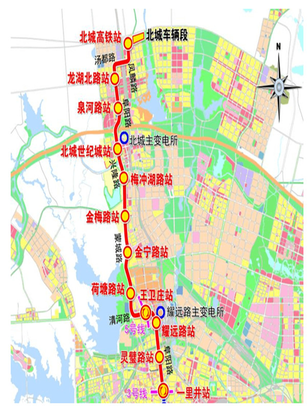 8號線一期工程線路全長22.5km,線路起始于3號線一里井站,終于北城高鐵站。線路沿阜陽北路—清河路—蒙城北路—興隆路—阜陽北路—湯都路—鳳麟路敷設(shè),止于北城高鐵站。全線為地下線,共設(shè)車站12座,均為地下車站,平均站間距為2020m,最大站間距2737m(龍湖北路站~北城高鐵站),最小站間距 1525m(耀遠路站~王衛(wèi)莊站)。8號線一期工程新建北城車輛段,位于規(guī)劃五湖大道以南、規(guī)劃嵇康路以北、鳳麟路東所圍地塊內(nèi)。8號線一期工程新建北城主變電所,位于興隆路與艾亭路交叉口北側(cè)地塊內(nèi)(繞城高速南側(cè));新建耀遠路主變電所,位于阜陽路與連水路交口東南象限。