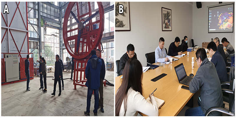 幕墻檢測(cè)設(shè)備驗(yàn)收:(A)專家現(xiàn)場(chǎng)勘驗(yàn)設(shè)備;(B)驗(yàn)收?qǐng)?bào)告會(huì)