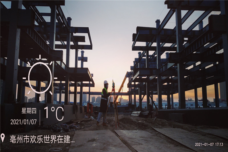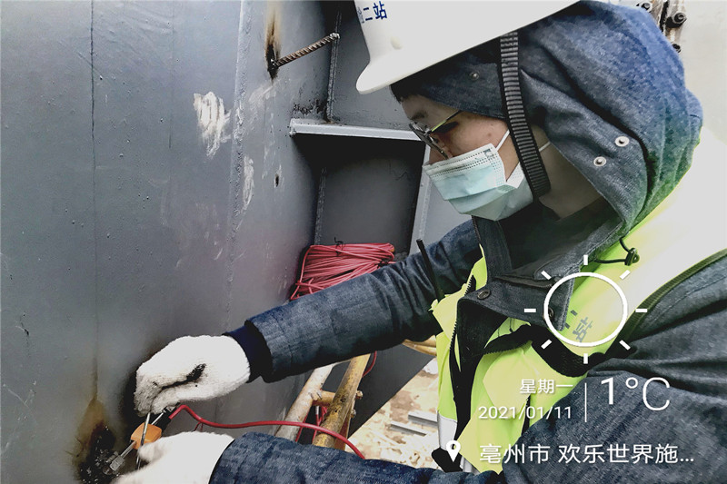 2020年末,在歲末年初、辭舊迎新之際,二站結構二所便早早地開始研究謀劃部署,積極尋求新業務突破,與北京城房有限公司就“亳州歡樂世界項目智慧城市生活體驗館鋼結項目”簽訂協議。該工程鋼構件從出廠檢測到施工過程中應力、變形全過程監測均由我站結構二所承擔,為首個全過程介入的鋼結構項目。該項目強度大、條件苦,加上天氣、現場工作條件、夜間作業等種種困難,任務十分艱巨。二站結構二所副所長李平介紹說:“二站監測業績稀缺,實踐經驗和技術的磨練更為重要”。于是,李平綜合權衡輕重后,決定暫停其他檢測項目,迅速拉起隊伍,帶領二站結構二所檢測精英小分隊于2020年最后一天凌晨抵達工程現場,打響了2021年檢測業務第一槍。
