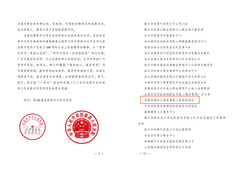 近日,第20屆全國(guó)青年文明號(hào)集體評(píng)選結(jié)果揭曉,安徽省建筑工程質(zhì)量第二監(jiān)督檢測(cè)站(簡(jiǎn)稱安徽建科質(zhì)檢二站)被命名為“第20屆全國(guó)青年文明號(hào)”榮譽(yù)稱號(hào)。