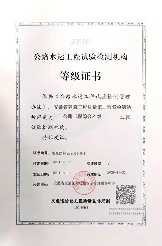 11月23日,從安徽省交通工程質量安全管理服務中心傳來喜訊,二站順利通過公路工程綜合乙級等級評定。