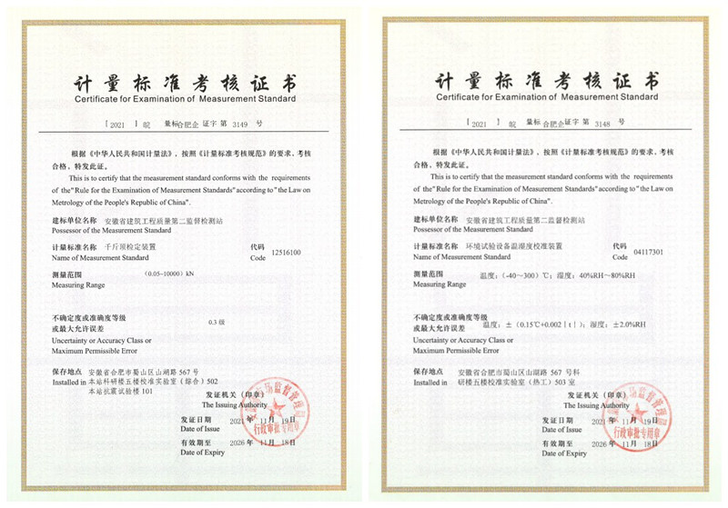 經過近一年的積極籌備,近日,二站特檢所順利通過省計量標準考核委員會的現場評審,取得了安徽省市場監督管理局頒發的千斤頂檢定裝置、0.3級測力儀標準裝置、鋼筋保護層、樓板厚度測量儀校準裝置、非自動衡器檢定裝置、環境試驗設備溫濕度校準裝置、天平檢定裝置計量標準考核證書。