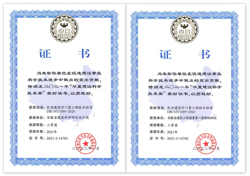 近日,我院及二站主持申報的《民用建筑外門窗工程技術(shù)標準 DB/34T1589-2020》項目榮膺“華夏建設(shè)科學技術(shù)”三等獎。