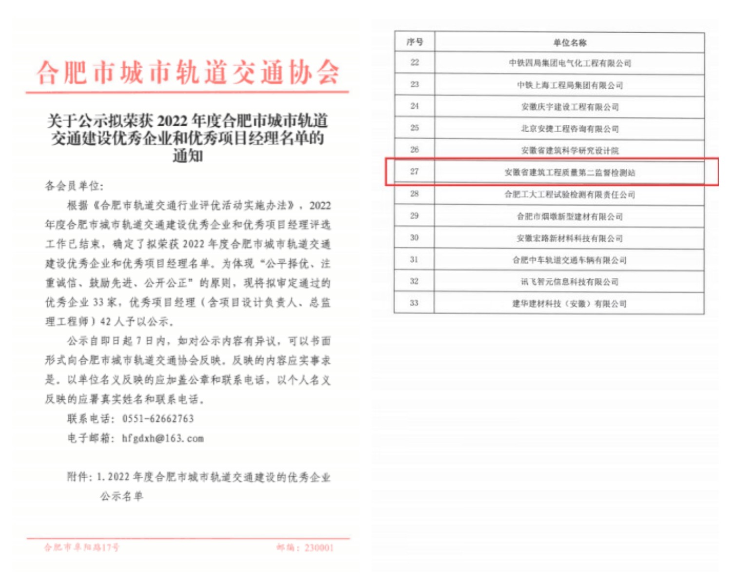 6月16日,從合肥市城市軌道交通協會傳來喜訊,安徽建工檢測科技集團有限公司獲評2022年度合肥市城市軌道交通建設“優秀企業”稱號。